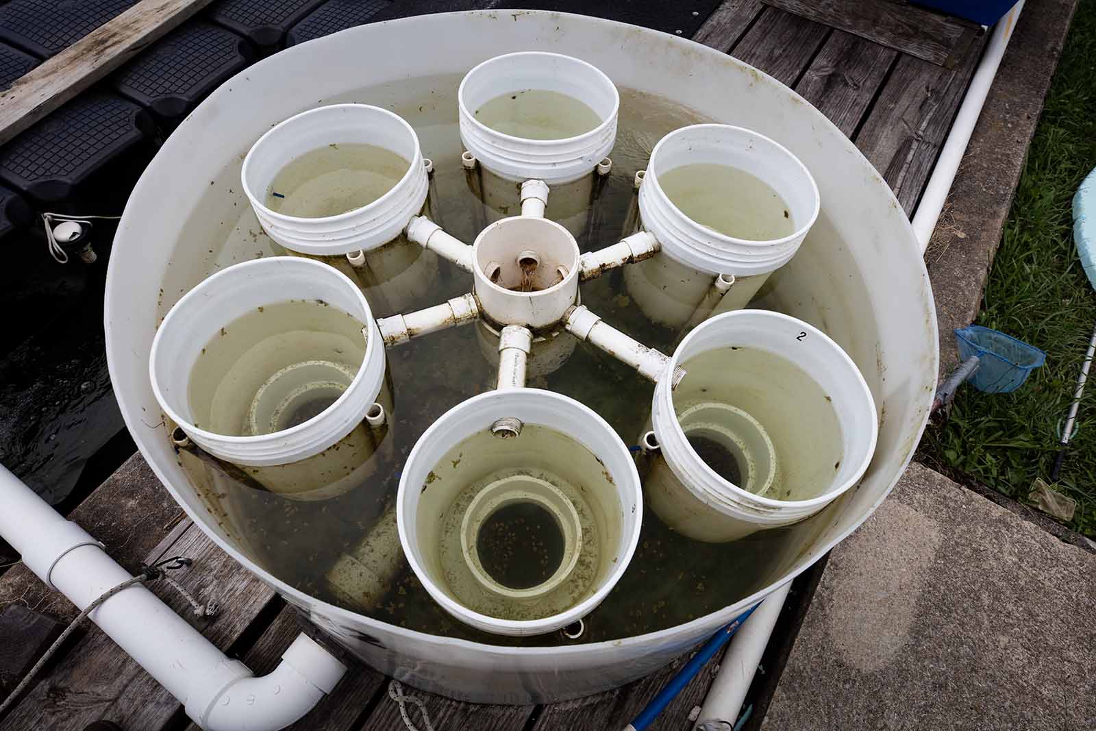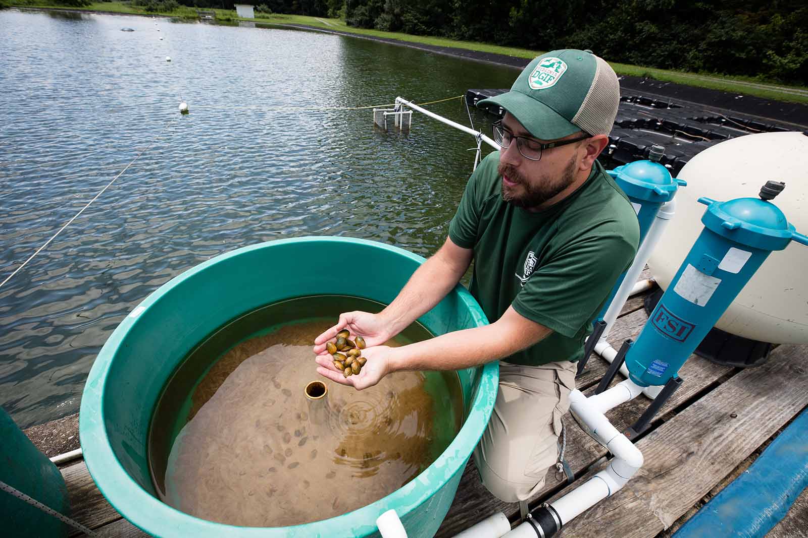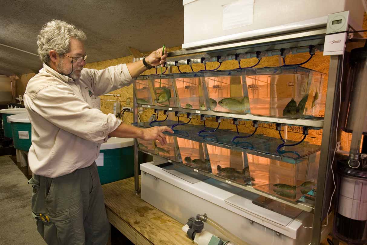 Ang mga recirculating system ay ginagamit sa AWCC para magparami ng freshwater mussels. Nagtatampok ang mga sistemang ito ng mga tangke na may indibidwal na pag-agos at pag-agos. Ang host fish na nahawaan ng larval mussels ay inilalagay sa mga tangke. Ang umaagos na tubig ay sinasala upang mangolekta ng mga bata pagkatapos na mahulog ang mga ito sa host fish at pagkatapos ay sinasala at ibomba pabalik sa sistema. Ang iba't ibang uri ng mga sistema ay idinisenyo at binuo ng mga kawani ng AWCC upang hawakan ang mga isda na may magkakaibang laki at gayahin ang kanilang mga pangangailangan sa tirahan. Ang mga system na ito ay idinisenyo upang pahintulutan ang pagpapalaganap ng higit sa isang species bawat system sa isang pagkakataon na nagpapahintulot sa paggawa ng higit sa 20 mga natatanging species bawat taon.
