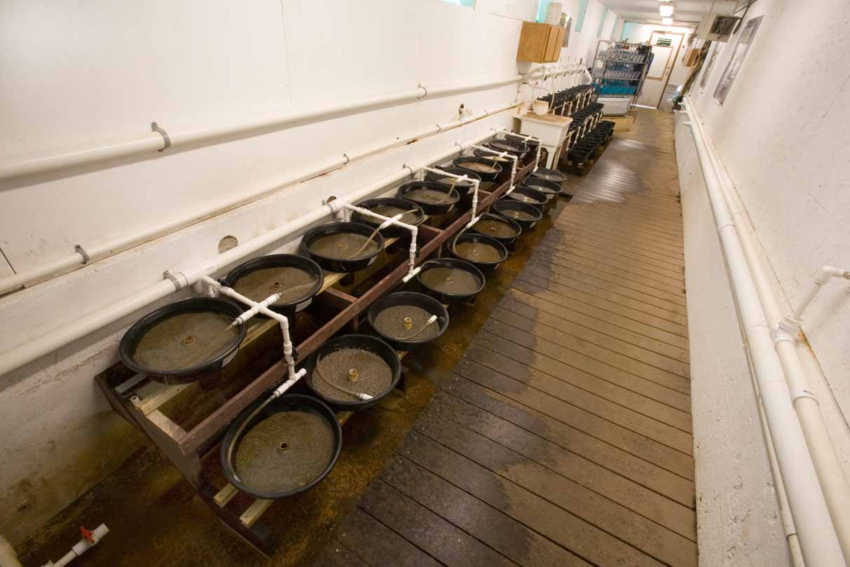 Habang ibinababa ng mga juvenile mussel ang host fish, binibilang sila at inilalagay sa mga sistema ng pag-aalaga upang payagan silang lumaki nang sapat upang madagdagan ang kanilang pagkakataong mabuhay sa ligaw. Kasama sa mga sistema ng pagpapalaki ang mga tangke na may substrate na ibinibigay ng nasala na tubig mula sa mga lawa ng AWCC. Ang tubig ay sinasala upang maalis ang mga mandaragit na maaaring kumonsumo ng maliliit na bata. Ang kanilang diyeta ng natural na lumalagong algae at bacteria ay dinagdagan ng komersyal na marine algae. Ang AWCC ay patuloy na bumubuo at sumusubok ng mga bagong sistema at pamamaraan ng pagpapalaki ng mga juvenile mussel sa pagsisikap na maabot ang pinakamabuting kalagayan na paglaki at mga rate ng kaligtasan.