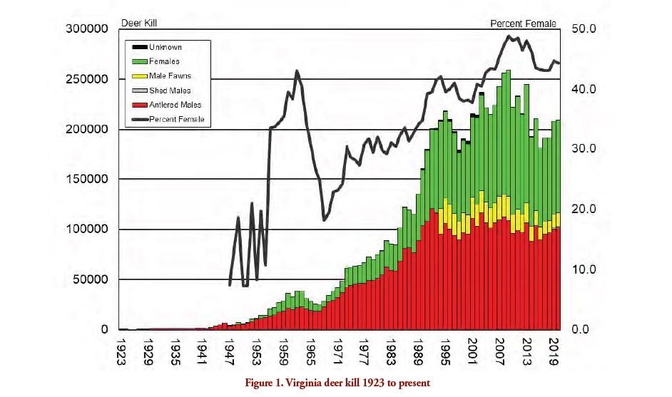 Noong nakaraang panahon ng usa, 209,356 ang mga usa ay iniulat na napatay ng mga mangangaso ng usa sa Virginia (Larawan 1). Kasama sa kabuuang ito 101,509 antlered bucks, 13,637 button bucks, at 93,005 ay (44% babae). Ang archery (kabilang ang mga crossbows) ay nagkakahalaga ng 14% ng pagpatay sa usa; mga muzzleloader, 23%; at mga baril, 63%.