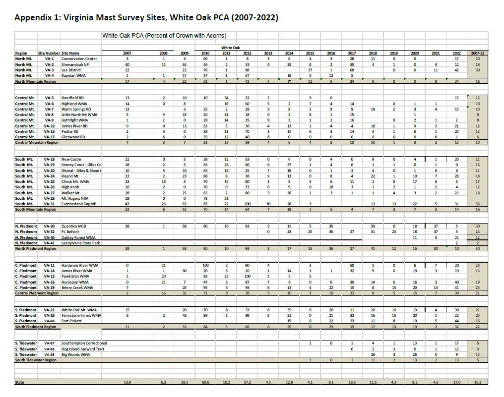 Tulad ng lahat ng mga taon, ang produksyon ng acorn ay lubos na nagbabago at napaka-depende sa site. Maraming mga ruta ang may mga lugar ng "bumper" mast production kahit na ang kanilang pangkalahatang average ng site ay mas mababa sa average. Ang red oak ay karaniwang mahirap sa lahat ng mga site at elevation sa taong ito na may napakalimitadong bulsa ng average na produksyon. Sa kabaligtaran, ang produksyon ng white oak ay higit sa average lalo na sa rehiyon ng Piedmont at sa mas mababang elevation ng mga ruta ng bundok.
