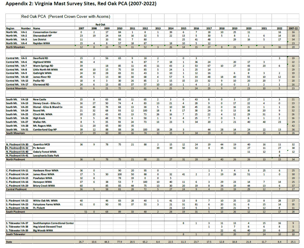 Ang produksyon ng acorn sa buong estado sa 2022 ay maaaring ikategorya sa pangkalahatan bilang average hanggang sa itaas ng average para sa white oak at mas mababa sa average hanggang mahirap para sa red oak species. Batay sa taunang hard mast survey, ang mga ruta ng white oak ay mas mataas sa average na pangmatagalang survey sa unang pagkakataon sa loob ng apat na taon, habang ang mga red oak ay nanatiling mas mababa sa average para sa ikalawang sunod na taon.
