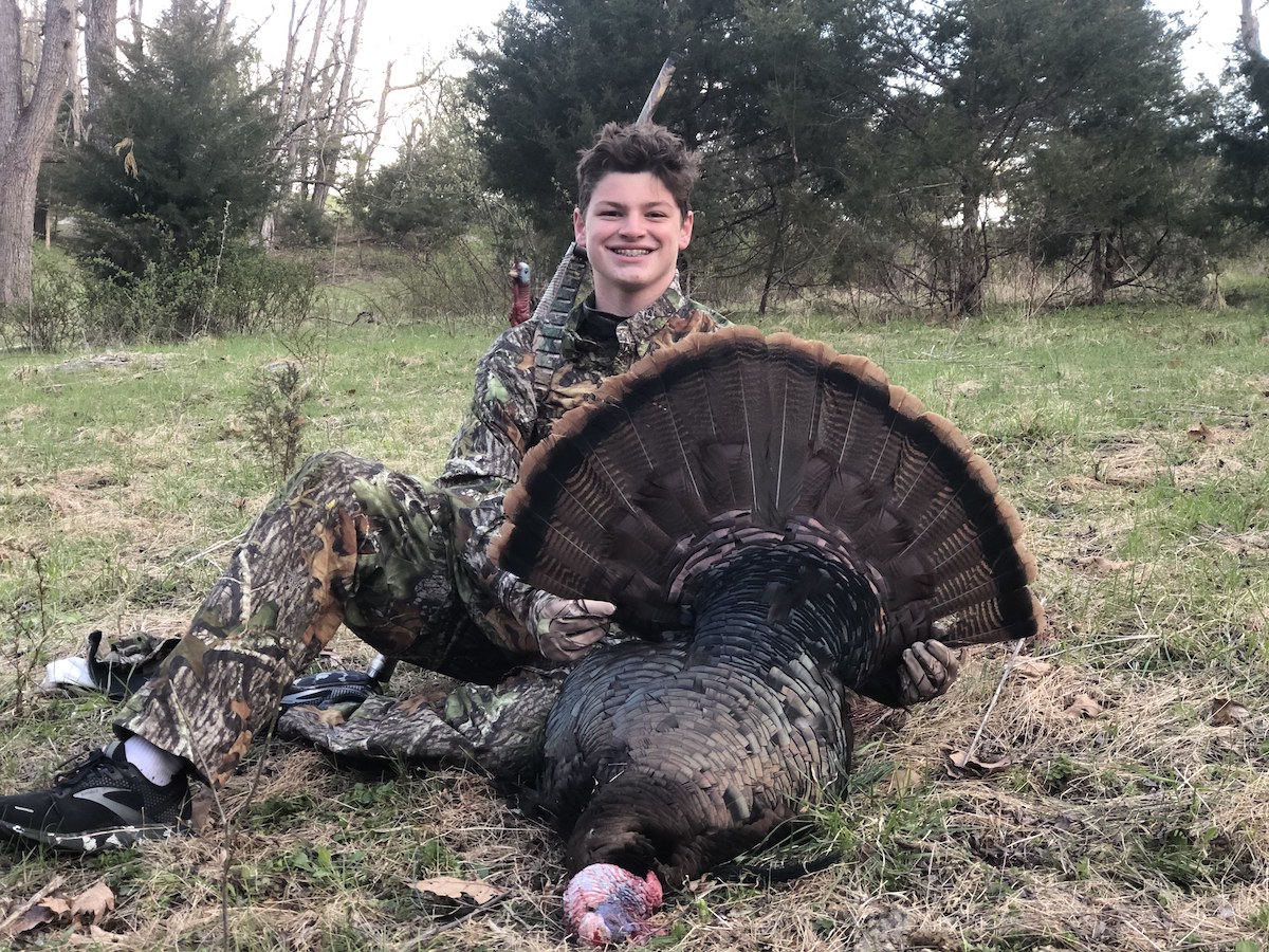 "Sa loob ng ilang minuto ng pag-set up, sinubukan namin ang ilang higit pang mga hen yelps at muli kaming nabigla nang marinig ang isang malakas na garalgal na lumamon sa malapit. Tahimik kaming nakaupo nang halos 20 minuto hanggang sa biglang sinabi ni Grant, "Here he comes!" Ang malaking mature gobbler ay nasa buong strut habang siya ay mabilis na lumapit sa aming mga decoy mula sa ridgeline sa itaas namin (ang mismong lokasyon kung saan kami lumipat). Inayos ni Grant ang butil ng shotgun at gumawa ng isang perpektong shot, ibinagsak ang ibon sa pagitan ng mga decoy. Kami ay labis na natuwa! Wala sa amin ang makapaniwala na sa aming pinakaunang youth turkey hunt na kami ay matagumpay sa pag-aani ng isang mature gobbler na magkasama. Sinabi ni Grant na, 'sa pangangaso ng usa, halos parang nangyayari ang sitwasyon sa paligid mo, at nakikipag-ugnayan ka lamang sa hayop kapag kinuha mo ang pagbaril. Iba ang pangangaso ng Turkey. Ikaw ang sitwasyon, at nakikipag-ugnayan ka sa hayop sa kabuuan ng pangangaso.' Ang pabo ay tumitimbang ng 23.5 pounds, may 11 1/4″ balbas, at spurs na may sukat na 1 1/4″ at 1 5/8″. Talagang ito ang pabo sa buong buhay!"