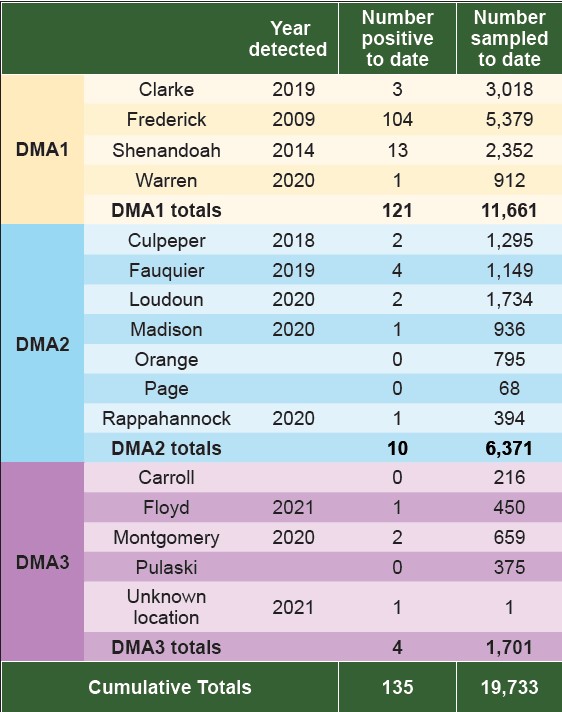 Disease Management Area (DMA) 1 (Clarke, Frederick, Shenandoah, at Warren county)