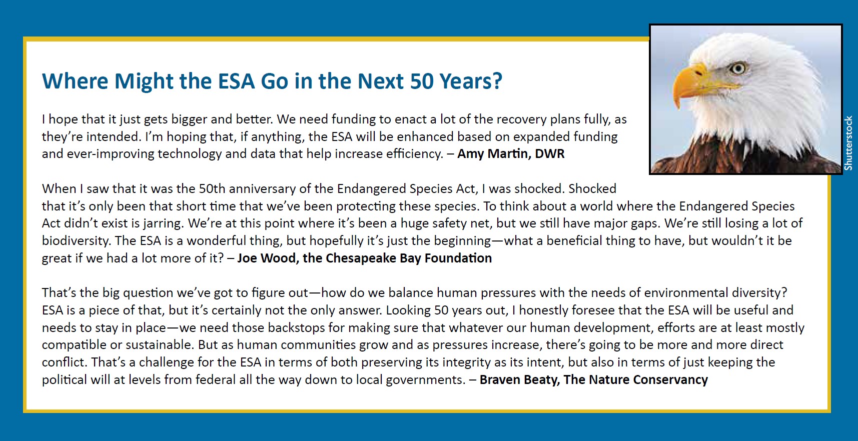 Nabanggit ni Martin na sa loob ng kanyang 22-taon na panunungkulan sa DWR, nakita niyang medyo nagbabago ang mga ugali, tulad ng kapag ipinagmamalaki ng mga pribadong may-ari ng lupa ang mga kalbong agila na namumugad sa kanilang lupain, nang ilang dekada na ang nakalipas ay nagalit sila dahil hindi maunlad ang lupain. “Kami ay nakakakuha ng higit pang suporta para sa pagsasaalang-alang ng mga hindi direktang epekto. Noong una akong nagsimula, maliban kung talagang hinahawakan mo ang hayop, walang makikinig sa iyo, "sabi niya. “Ngayon ay nagsisimula nang sabihin ng mga tao, 'Riparian buffers upang makatulong na mapabuti ang kalidad ng tubig para mabuhay ang hayop—makatuwiran iyon.' ”