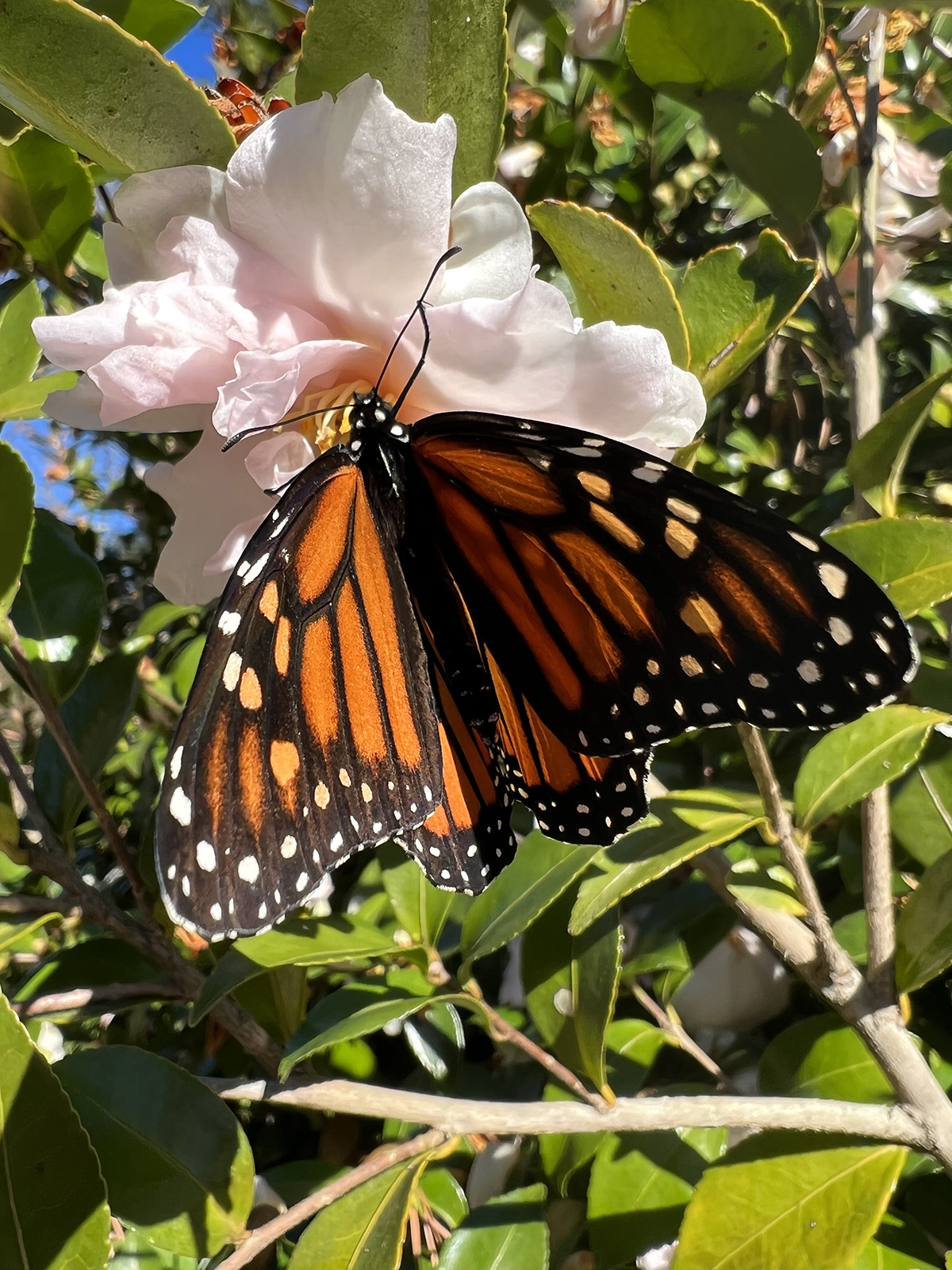 Mayroon akong ilang camellia sa harap at likod-bahay. Bilang mga evergreen, nagbibigay sila ng magandang takip sa buong taon. Pinagmumulan din sila ng nektar at pollen para sa mga insekto sa maaga/o huli na panahon tulad nitong monarch butterfly na nagpakita noong Nobyembre!
