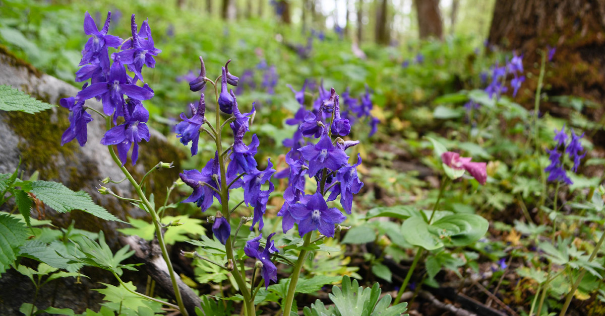 Ang dwarf larkspur ay gumagamit ng malalim na lila na bulaklak at pumapasok sa malalaking stand ng trillium.