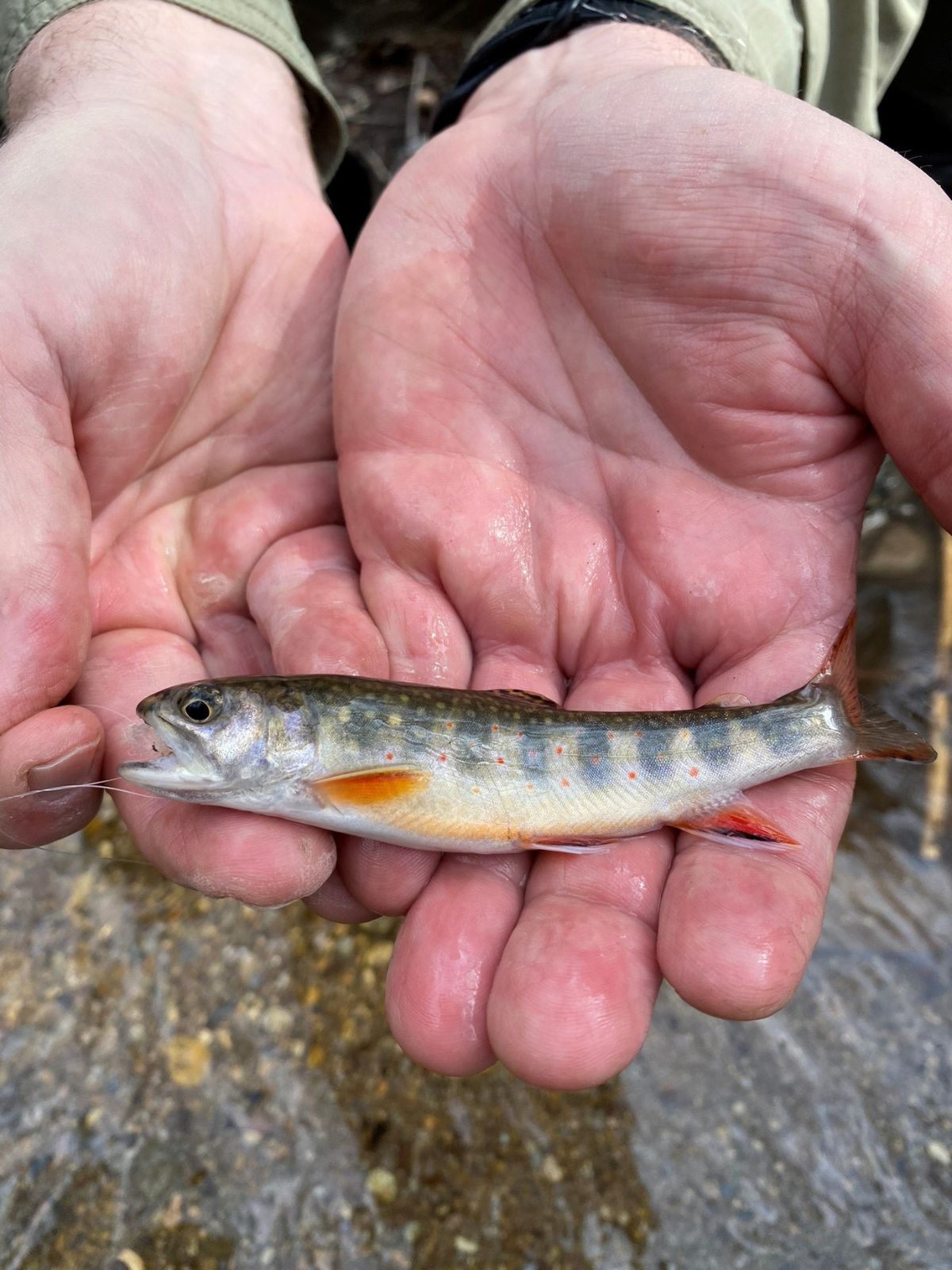 Nang makilala ko ang gabay, dinala niya ako sa isang maliit na batis sa malapit na isang tributary ng Whitetop Laurel. Ang pangingisda sa seksyong ito ay hindi masyadong produktibo, ngunit nakarating ako sa isang dink ng isang ligaw na bahaghari. Isa na hindi karapat-dapat sa isang larawan.