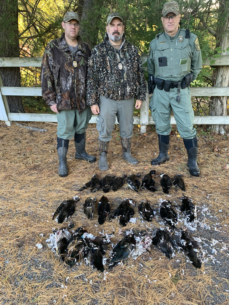 Sa mga oras ng umaga ng Oktubre 8, 2022, Sgt. Goszka, Master Officer Mark Sanitra, at Officer First Class Roger Palmisano ay nag-navigate sa malayong lugar at nagsimulang subaybayan ang mga baited blinds. Noong 6:30 am, apat na mangangaso ang pumasok sa creek blind at nagsimula ng kanilang ilegal na pangangaso. Sa 7:30 am, at pagkatapos ng 21 na mga putok ay nagpaputok, nakipag-ugnayan ang mga opisyal sa grupo. Napag-alamang nakapatay ang grupo ng pitong wood duck at dalawa na hindi na nabawi. Alam ng bawat miyembro ng grupo na ang lugar ay may pain. Ang karagdagang pagsisiyasat ay nagsiwalat na noong Oktubre 7, 2022, ang parehong grupo ay nanghuli sa lugar na may pain, pumatay ng 14 mga itik na kahoy, at ang mga bangkay ay nakuhang muli. Ang lahat ng apat na subject ay kinasuhan ng dalawang bilang ng pangangaso sa isang baited area at isang subject ang kinasuhan ng paglampas sa kanilang limitasyon sa wood ducks.