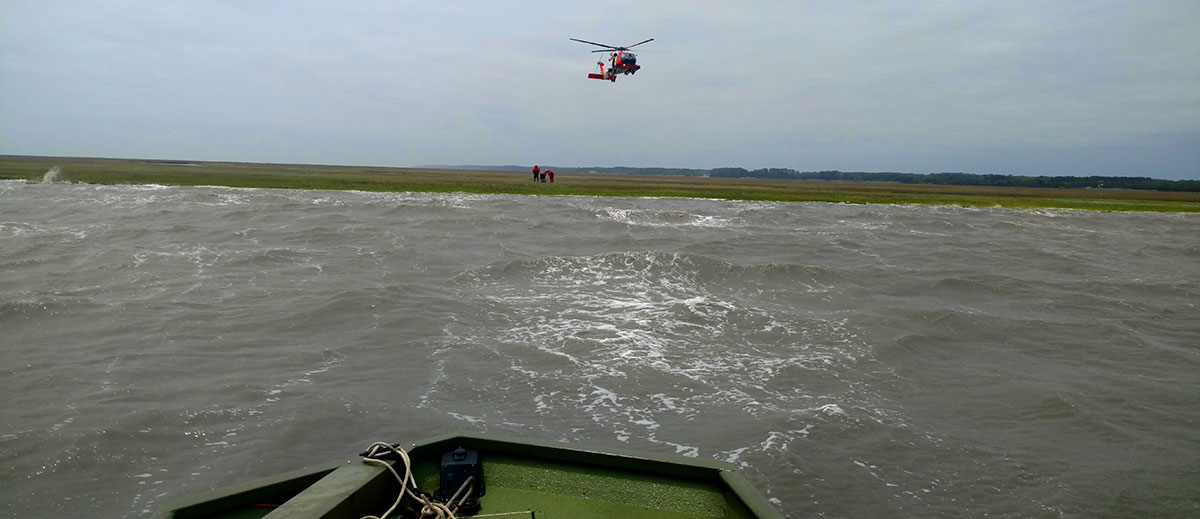 Dumating ang mga opisyal at nakita ang mga boater halos kasabay ng USCG helicopter. Ang 17' Bass Tracker boat ay nasobrahan ng maalon na kondisyon ng dagat at malakas na hangin at na-ground sa tidal marsh. Ang mga sakay ay nasa labas ng bangka at nakatayo sa latian na binabaha ng pagtaas ng tubig. Nakipag-ugnayan sina CPO Bratton at Murray sa USCG Rescue Swimmer at aircrew para ilikas ang mga boater mula sa latian, i-secure ang barko at ibalik ang mga boater sa tuyong lupa.