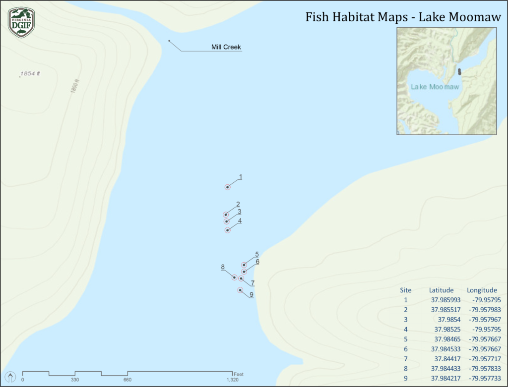 Una, nag-aalok ang Lake Moomaw ng "two-tiered fishery." Sa tag-araw, ito ay nagsasapin-sapin, na may mainit, hindi gaanong siksik na tubig sa itaas na patong; isang "thermocline" kung saan ang temperatura ay biglang bumaba ngunit ang tubig ay naglalaman pa rin ng maraming dissolved oxygen; at isang malalim, malamig na layer na may kaunting oxygen. Ang summer thermocline, sa pangkalahatan ay 15-30' malalim, ay pangunahing tirahan ng brown at rainbow trout, na kumakain ng maraming alewives at mas maliit na populasyon ng gizzard shad. Ang mga alewives ay kumakain ng plankton, maliliit na halaman at hayop na inaanod ng hangin at agos ng ilog sa itaas na haligi ng tubig. Gumagala sila sa lawa, naghahanap ng mga lugar na may konsentrasyon ng pagkain pati na rin ang komportableng kondisyon ng tubig. Ang mga alewives at gizzard shad ay masustansya, kaya masarap kumain ang mga trout na ito. Maraming kayumanggi ang umaabot sa 3-5 pounds, at ang ilan ay lumalapit 10. Ang mga mangingisda ng trout ay nanonood ng kanilang mga sonar screen para sa mga isda na nakabitin sa paligid ng mga bola ng pain sa "mga mangkok," ang dalawang bilog na lugar sa ibabang lawa, tulad ng ginawa namin ni Hallacher sa aking pagbisita. Habang lumalamig ang tubig sa ibabaw sa taglagas, ito ay nagiging mas siksik at lumulubog, na nagiging sanhi ng lawa upang "bumalik" at paghaluin ang haligi ng tubig, kaya ang baitfish at trout ay maaaring nasaan man.