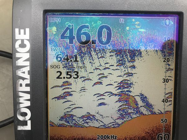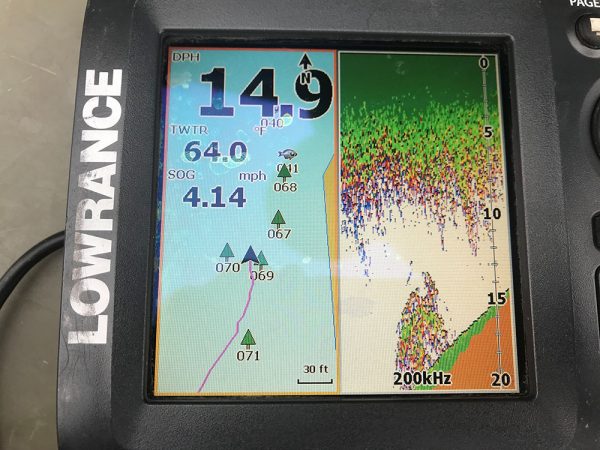 "Dadalhin ako ng electronics sa ballpark, ngunit ang pag-linya ng mga marka [mga hanay ng visual] ang huling susi," sabi ng Sangay. “Kung anuman ang ginawa mo ngayon, maaari mong ipagpatuloy at itakda ito para bukas at magpatuloy sa paghahanap. Ang bass ay nauugnay sa pain sa lahat ng oras, karamihan ay mga alewives, gaya ng na-verify namin sa pamamagitan ng electro-fishing. Sa mga ledge, maingat siyang nangingisda ng shakey-head jigs na binihisan ng natural-color trick worm at tubes, ngunit PALAGI niyang isinasawsaw ang kanilang mga buntot sa chartreuse-green, garlic-flavored Spike-It dye.