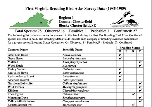 Available na ngayon ang mga listahan ng species at data ng status ng breeding para sa bawat block na sinuri sa unang VA Breeding Bird Atlas sa pamamagitan ng Atlas Block Explorer tool. Ang pagsusumikap na ito ay naganap mula 1984-1989, kaya halos 30 taon na ang lumipas, mula noong nakolekta ang mga datos na ito. Maraming pagbabago ang naganap sa buong landscape ng Virginia, na nagha-highlight kung bakit napakahalaga ng pangalawang VA BBA para sa konserbasyon ng ibon sa rehiyon. Ang data na nakolekta ngayon ay ihahambing sa unang dataset ng Atlas upang matukoy ang mga pagbabago sa mga distribusyon ng pag-aanak ng ibon sa buong estado. Ang mga distribusyon na ito ay maaaring ma-overlay ng data sa paggamit ng lupa upang matulungan kaming mas maunawaan kung paano tumugon ang iba't ibang species ng mga ibon sa pagbabago ng mukha ng Virginia.