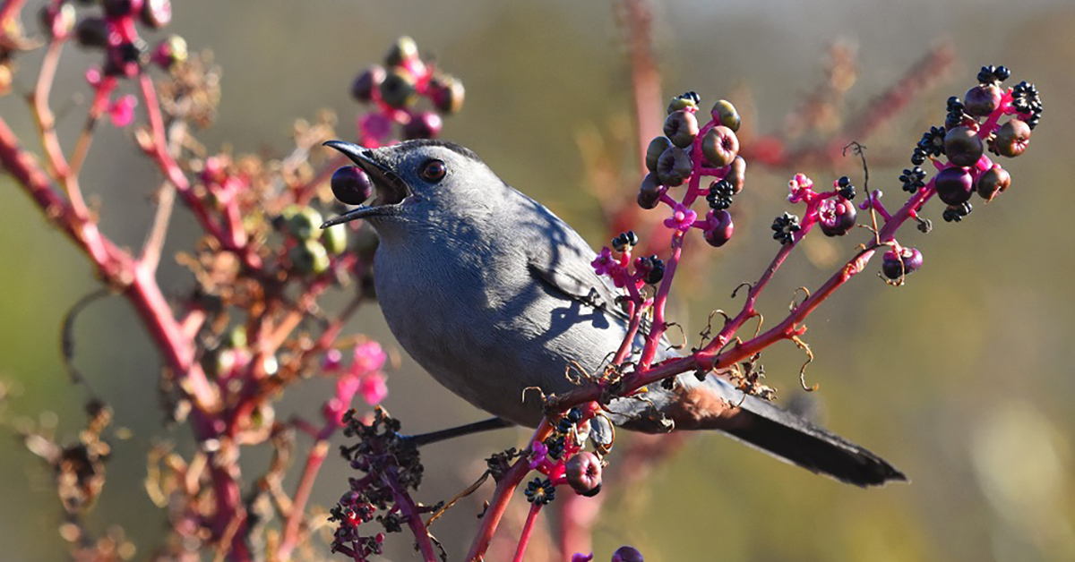 Isang ibong pusa na kumakain ng ilang pokeweed berries. Larawan ni Betty Sue Cohen