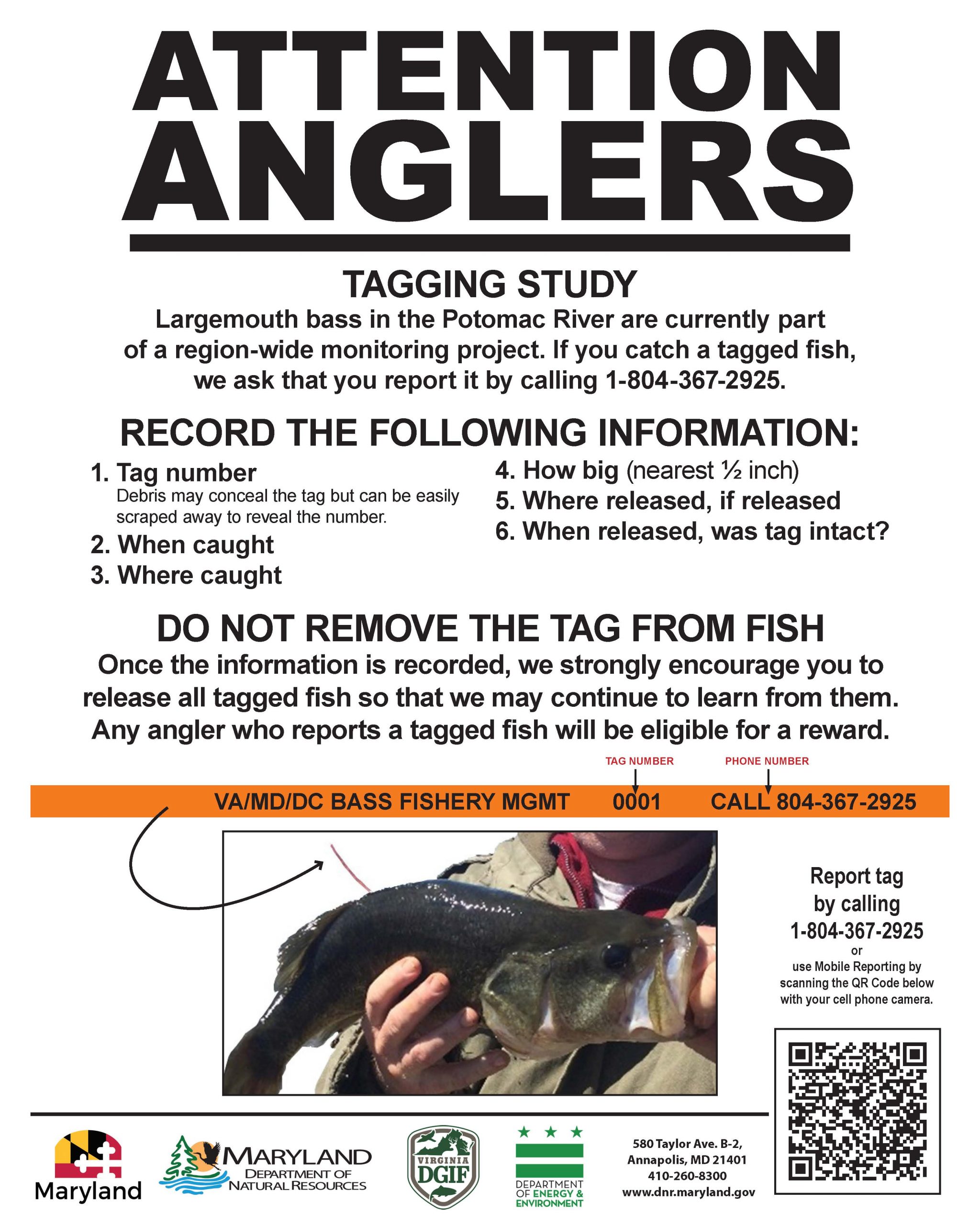 Ang largemouth bass sa tidally influenced freshwater habitats ng Potomac River ay kukunan sa electrofishing survey at pagkatapos ay susukatin, timbangin, ita-tag, at ilalabas. Ang mga mangingisda na nakahuli ng naka-tag na isda ay maaaring mag-ulat ng numero ng tag, petsa ng pagkuha, laki ng isda, at mga lokasyon ng paghuli at pagpapalabas. Ang mga mangingisda na nag-uulat na nakahuli ng naka-tag na isda ay papasukin sa taunang loterya para sa isang premyo. Maaari silang tumawag sa 804-367-2925 o mag-email sa basstag@dwr.virginia.gov upang mag-iwan ng impormasyon.