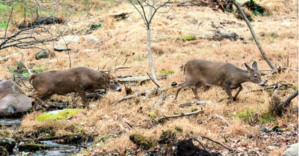 Ang peak ng whitetail rut ay na-trigger ng photoperiodic timing, na ang dami ng liwanag ng araw na ibinibigay sa anumang 24-oras na araw na tumama sa Nobyembre bawat taon. Ang paghabol at pagtatanggol sa kanilang home range ay ang inaasahan ng mga mangangaso na makita sa panahong ito. Gayunpaman, napakapambihira na pagmasdan ang agresibong pag-uugali na ito noong Enero. Larawan ni Dr. Leonard Lee Rue III