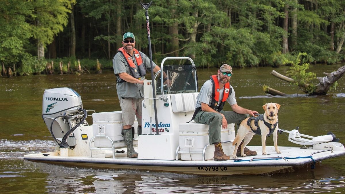 Ngunit ang pagpayag na mangyari iyon sa Upper Chickahominy ay hindi isang opsyon. May isang puting bangka na paparating sa ilog, isa na walang gilid at isang patag na deck na idinisenyo upang lumutang sa loob lamang ng ilang pulgada ng tubig. Sa gulong ay si Todd Englemeyer, isang Virginia Department of Wildlife Resources