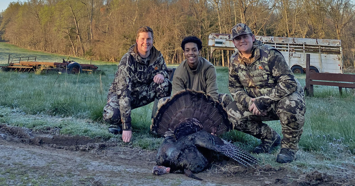 Pagkalipas ng ilang minuto, wala ni isa, kundi dalawang mature gobbler ang lumitaw sa gilid ng kakahuyan, sa likod lamang ng bakod ng mga baka. Habang lumilipat ang mga ibon sa loob ng 35 yarda, naghanda si Na'Quan na kunin ang kanyang pagbaril sa isa sa mga ibon. Pagsikat pa lang ng araw, inani ni Na'Quan ang kanyang unang pabo, na tumitimbang sa 23.26 lbs na may 10.5″ balbas at humigit-kumulang 1″ spurs. Habang nakatayo kami sa ibabaw ng marilag na ibon, tinanong ko si Na'Quan, "Ano ang pakiramdam mo?" Malaki ang mga mata at malapad ang ngiti, tumugon siya, "Nakakuha ako ng pabo!"