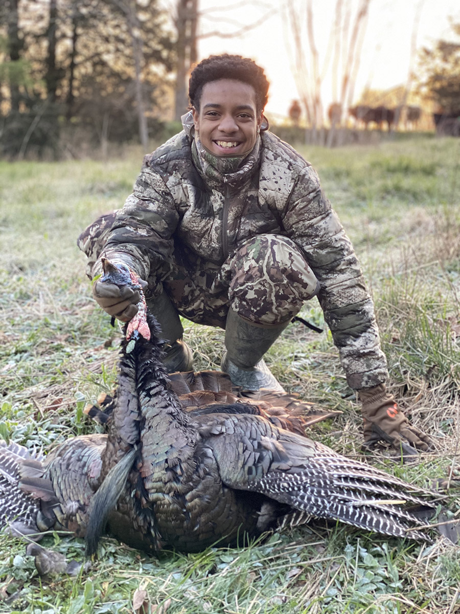 Pagkalipas ng ilang minuto, wala ni isa, kundi dalawang mature gobbler ang lumitaw sa gilid ng kakahuyan, sa likod lamang ng bakod ng mga baka. Habang lumilipat ang mga ibon sa loob ng 35 yarda, naghanda si Na'Quan na kunin ang kanyang pagbaril sa isa sa mga ibon. Pagsikat pa lang ng araw, inani ni Na'Quan ang kanyang unang pabo, na tumitimbang sa 23.26 lbs na may 10.5″ balbas at humigit-kumulang 1″ spurs. Habang nakatayo kami sa ibabaw ng marilag na ibon, tinanong ko si Na'Quan, "Ano ang pakiramdam mo?" Malaki ang mga mata at malapad ang ngiti, tumugon siya, "Nakakuha ako ng pabo!"