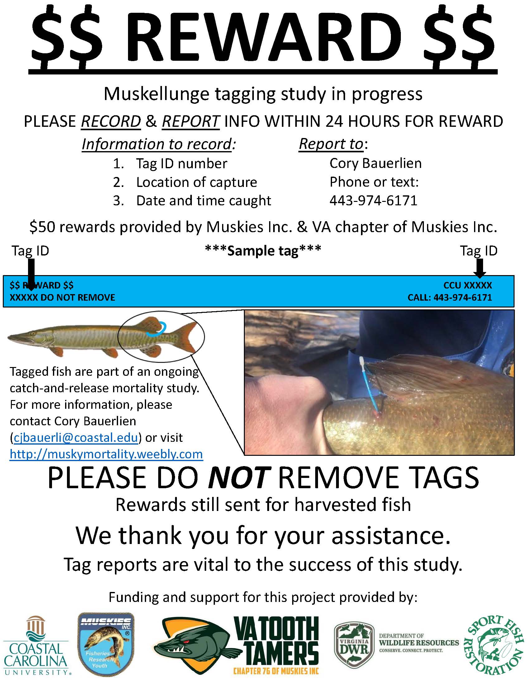 Ang mga mangingisda na nakakuha ng naka-tag na isda ay maaaring mag-ulat ng tag kay Cory Bauerlien ng Coastal Carolina University sa pamamagitan ng telepono o text sa 443-974-6171 sa loob ng 24 oras kapalit ng $50 na reward. Para sa karagdagang impormasyon, tingnan ang https://muskymortality.weebly.com/.