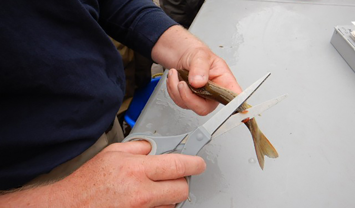 Ang mga nakolektang isda ay inilalabas mula sa mga barge at inilalagay sa mga holding tank kung saan ang bawat isa ay kinikilala, sinusuri para sa pangkalahatang kalusugan, at sinusukat. Bagama't ang aming diin ay sa non-game fish at kamakailan lamang na spawned brown trout, nakakolekta din kami ng magandang rainbow at brown trout.