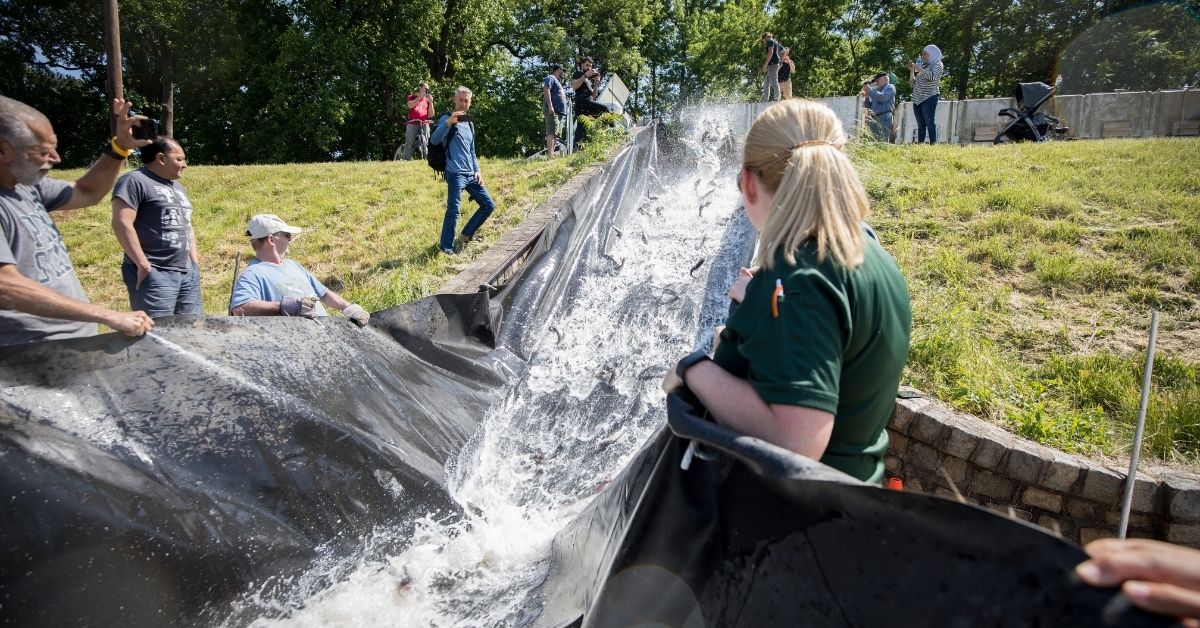 "Bawat taon ay nagdudulot ng mga bagong hamon," sabi ni Dahlem. “Sa taong ito, gumamit kami ng lumang pond liner na materyal para gawing 50-foot fish slide ang isang park stone stairwell upang maihatid ang mga isda mula sa trak patungo sa tubig na may pinakamababang stress sa paghawak sa kanila (at sa amin) hangga't maaari."