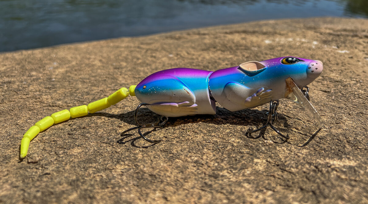 Ang pangatlong pain sa aking mga rekord ay ang natuklasan ko mga dalawang taon na ang nakararaan—isang daga. Ang mga ito ay malalaking pain na mababaw at nagtatapon ng malaking wake. Gusto kong gumamit ng 20 lb copolymer line sa isang 8′ heavy action graphite composite baitcasting rod. Ibinabato ko ang mabigat na copolymer dahil sa lakas ng pagkabigla—hindi mura ang mga daga at may tirintas, maaari mong matanggal ang pain sa isang cast. Inihahagis ko ang pang-akit na ito sa parehong mga lugar kung saan itatapon ko ang crawler at pangisda ito sa parehong paraan—hayaan itong tumama sa tubig, bumilang hanggang lima, at dahan-dahang iikot.