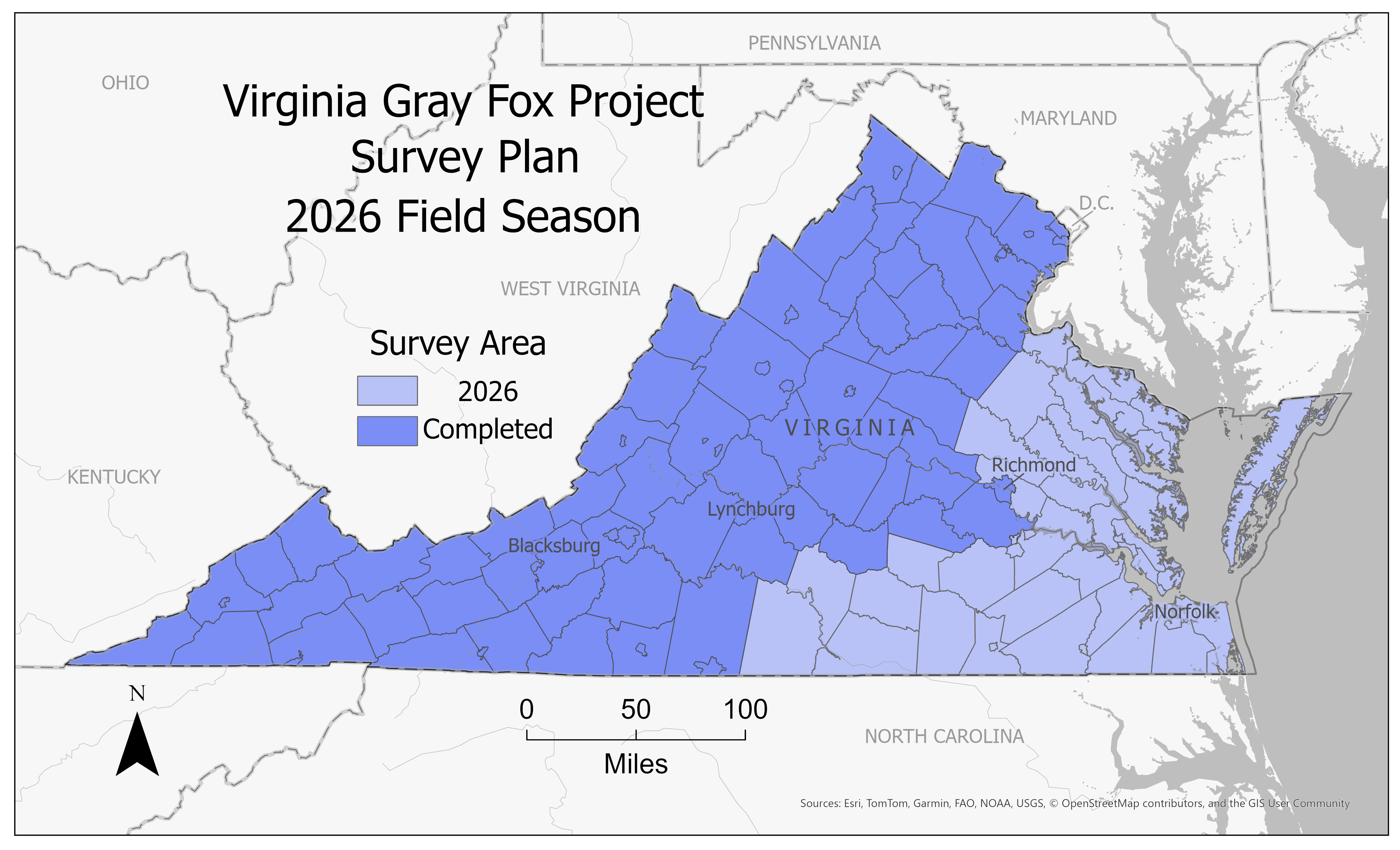 Ang tatlong-taong proyekto ay makakakuha ng data sa populasyon ng kulay-abo na soro, kasama ang iba pang mga wildlife, sa buong estado. Noong 2024, ang mga mananaliksik ay nakatuon sa mga kanlurang county ng Virginia, na nagtatakda ng mga camera ng proyekto sa 425 mga site, na may karagdagang 38 camera na naka-set up ng mga kalahok na may-ari ng lupa. Noong 2025, ang pangkat ng pananaliksik ay nakatuon sa rehiyon ng Piedmont, na nagtatakda ng mga camera sa 492 mga lokasyon, na may karagdagang 71 camera na naka-set up ng mga kalahok na may-ari ng lupa. Sa 2026, ang koponan ay sumasaklaw sa natitirang mga county sa timog-gitnang at timog-silangang rehiyon ng Piedmont Coastal Plan (kabilang ang Eastern Shore). Hinihiling ng proyekto ang pakikilahok ng mga may-ari ng lupa sa mga rehiyong ito.
