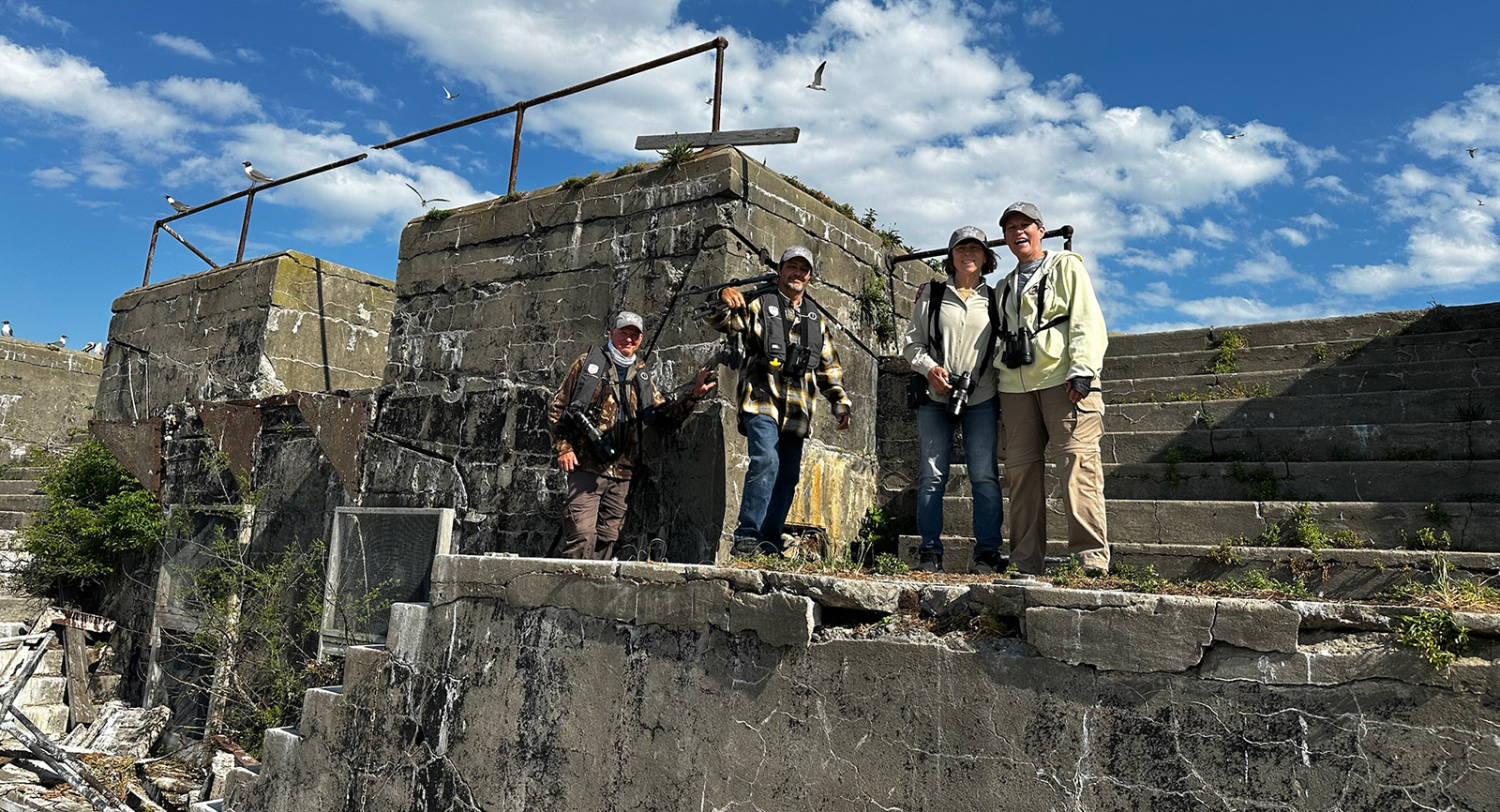 Ang nanalong koponan ng 2024 Virginia Birding Classic, The Twitchers ([mula kaliwa] Steve Myers, Amy Meyers, June McDaniels, at Andrew Baldelli), ay nasiyahan sa isang araw ng birding sa seabird nesting site ng Fort Wool salamat sa kanilang tagumpay.