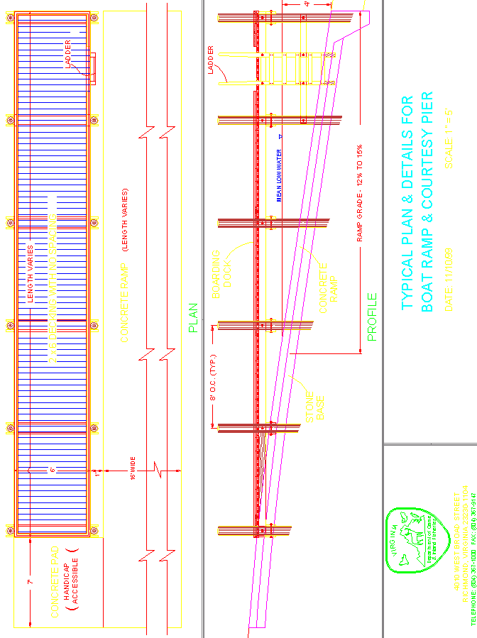 Sa pangkalahatan, ang mga rampa ay dapat na may mga slope na 12-15% na ang kongkreto ay umaabot sa lugar ng pagliko at pagtatanghal ng dula na sapat ang layo para sa mga gulong ng trailer upang maalis ang sloped na seksyon ng ramp bago umalis ang mga gulong ng paghila ng sasakyan sa kongkreto. Kung hindi, ang mga gulong ng paghila ng sasakyan ay maaaring umikot at mahukay sa ibabaw habang ang trailer at bangka ay hinihila pataas sa rampa. Ang mga rampa na 16 talampakan ang lapad ay mas gusto para sa pangkalahatang publiko kahit na maraming umiiral na 12-foot ramp ang napatunayang kasiya-siya sa mga pasilidad na mababa ang paggamit. Ang mga rampa na inilagay sa mga umaagos na ilog ay dapat pumasok sa ilog sa isang anggulo sa ibaba ng agos upang mabawasan ang patagilid na pagtulak sa bangka habang inilalagay ito sa o sa labas ng trailer. Gayundin, ang isang rampa na nakalagay sa isang anggulo ay kadalasang nakakaipon ng mas kaunting silt pagkatapos ng panahon ng mataas na tubig. Kung kailangang gumawa ng pagputol sa pampang ng ilog, itabi ang mga dalisdis sa likod hangga't maaari upang mabawasan ang dami ng tubig na nakakulong sa hiwa sa panahon ng pagbaha, kaya bawasan ang dami ng silt na nadeposito sa rampa. Magbigay ng mga stabilized na kanal sa bawat gilid ng ramp upang mahawakan ang runoff sa panahon ng malakas na pag-ulan.