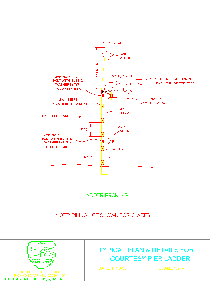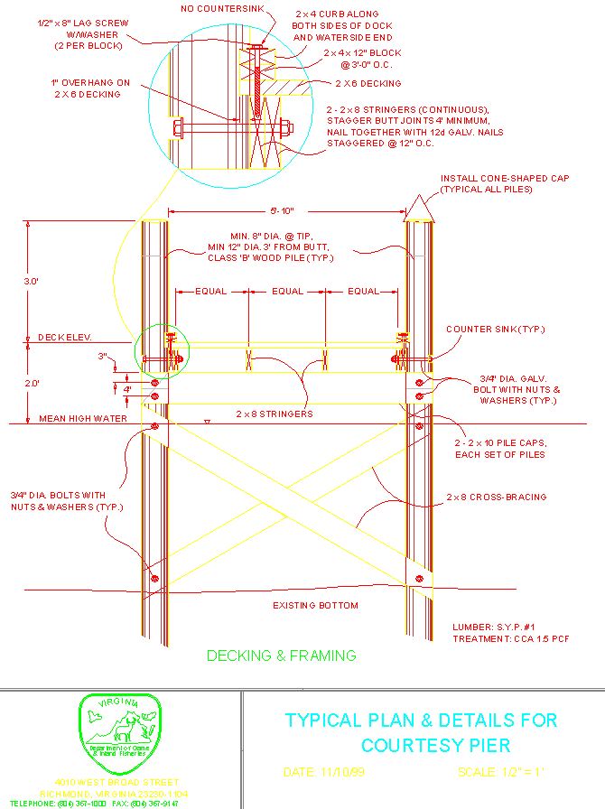 Ang kahoy para sa mga pier ay dapat tratuhin ng presyon upang mapahina ang pagkabulok. Sa kasaysayan, ang kahoy na ginagamot sa CCA (Chromated Copper Arsenate) ang napiling paggamot para sa pagtatayo ng aming mga pier. Itinuring ng Environmental Protection Agency (EPA) ang kahoy na ginagamot sa CCA na hindi angkop para sa paggamit sa mga aplikasyon kung saan ang kahoy ay maaaring madalas na madikit sa balat. Ang kahoy na ginagamot ng CCA ay hindi dapat gamitin sa tubig-tabang. Para sa kadahilanang ito, gumagamit kami ng CCA treated wood kung saan ang kahoy ay palaging nakikipag-ugnayan sa tubig-alat, o sa isang palaging basang kondisyon, tulad ng mga pier piling, cross bracing, deck stringers at joists. Para sa lahat ng application na may potensyal na magkaroon ng contact sa balat, pinili naming gamitin ang alternatibong paggamot ng Copper Azole (CA) para sa compatibility sa galvanized coated hardware. Ang CCA na kahoy na palaging makakadikit sa tubig-alat ay dapat tratuhin sa antas na 2.5 libra ng pagpapanatili sa bawat cubic foot (pcf) ng kahoy. Ang kahoy na tatanggap ng saltwater splash ay dapat magkaroon ng retention na 1.5 pcf. Para sa sariwang tubig at kahoy sa mga aplikasyon ng tubig-alat na madalas na makakadikit sa balat (tulad ng mga decking board, handrail, at hagdan), CA treated wood na itinalaga para sa "ground contact o fresh water" na may minimum na pagpapanatili ng 0.21 pcf at isang ginustong pagpapanatili ng 0.31 pcf ay ang kahoy na pinili. Ang lahat ng bolts at pako ay dapat na mainit na dipped galvanized. Kung saan ang hardware ay madalas na makakaugnay sa tubig-alat, ang isang mas mahusay na pagpipilian ay hindi kinakalawang na asero dahil ang aming karanasan ay na kahit na ang galvanized na hardware ay kalawang sa oras.