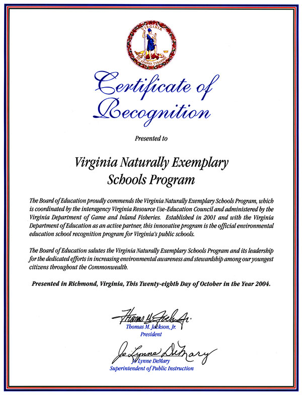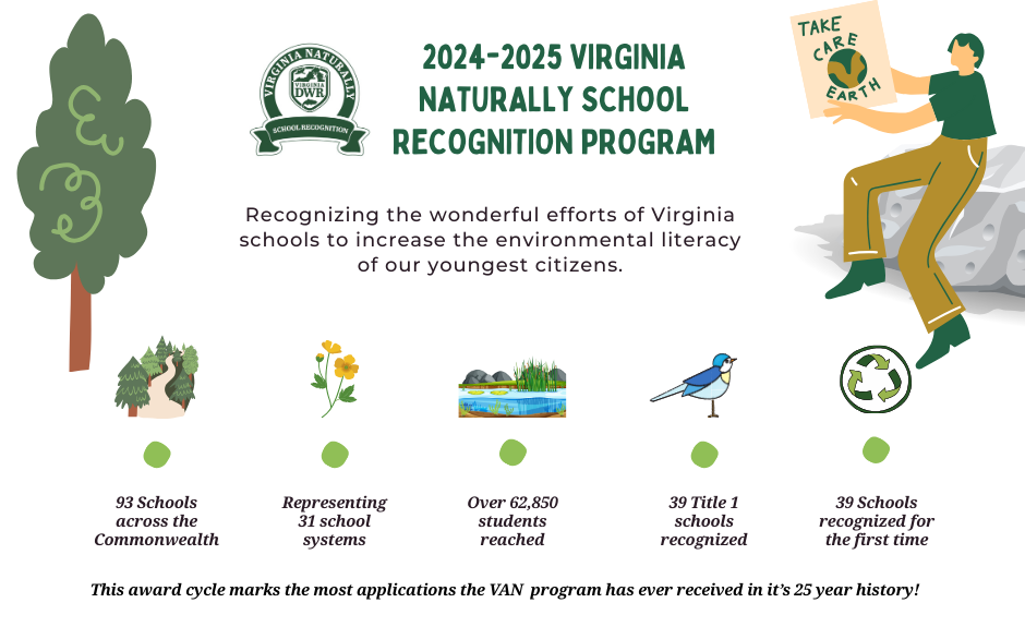 Kung ang iyong paaralan ay nagsusumikap na isama ang edukasyon tungkol sa kapaligiran sa kurikulum, hinihikayat ng DWR na mag-aplay para sa Virginia Naturally School Recognition Program sa panahon ng bukas na aplikasyon sa Abril 1-Hunyo 30 bawat taon. Ito ay hindi isang beses na parangal, ngunit isa kung saan maaari kang bumuo at makamit ang mga karagdagang pagkilala sa bawat taon na iyong lalahok. Hindi na kami makapaghintay na kilalanin ang kahanga-hangang pagsisikap ng mga paaralan sa Virginia na pataasin ang environmental literacy ng ating mga pinakabatang mamamayan.