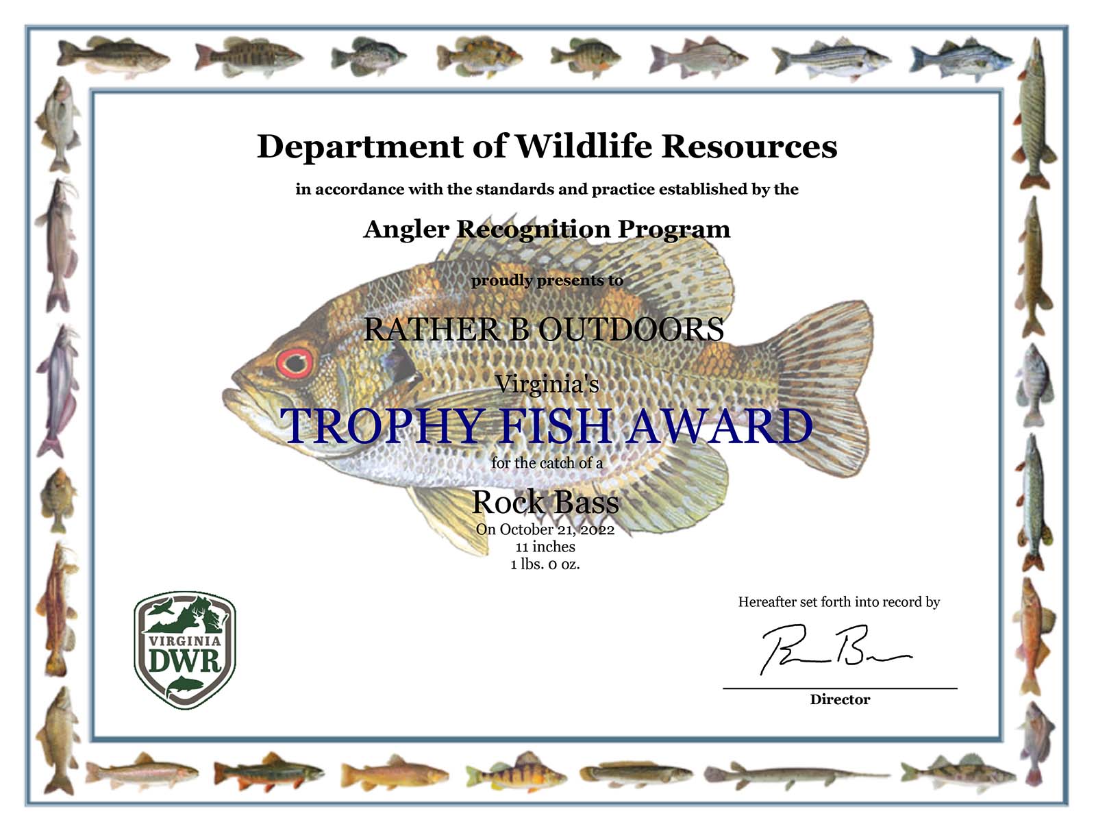 Ang mga mangingisda ay tumatanggap ng opisyal na trophy fish award certificate para sa kanilang huli ng bawat trophy-size na isda na nakarehistro sa Online Virginia Angler Recognition Program. Nagtatampok ang mga sertipiko ng likhang sining ng kilalang wildlife artist na si Duane Raver. Ang bawat sertipiko ay may watermark ng mga species ng isda na nahuli ng angler at naka-personalize sa pangalan ng angler, petsa ng paghuli, at ang bigat at/o haba ng isda. Ang mga sertipiko ay iginawad sa elektronikong paraan bilang isang PDF at maaaring tingnan o i-print sa bahay upang ibahagi sa mga kaibigan at pamilya. Ang mga certificate ay perpekto para sa iyong social media account, ibahagi ang iyong catch at i-tag ito sa #VAWildlife at maaari kang maitampok sa mga pahina ng social media ng DWR.