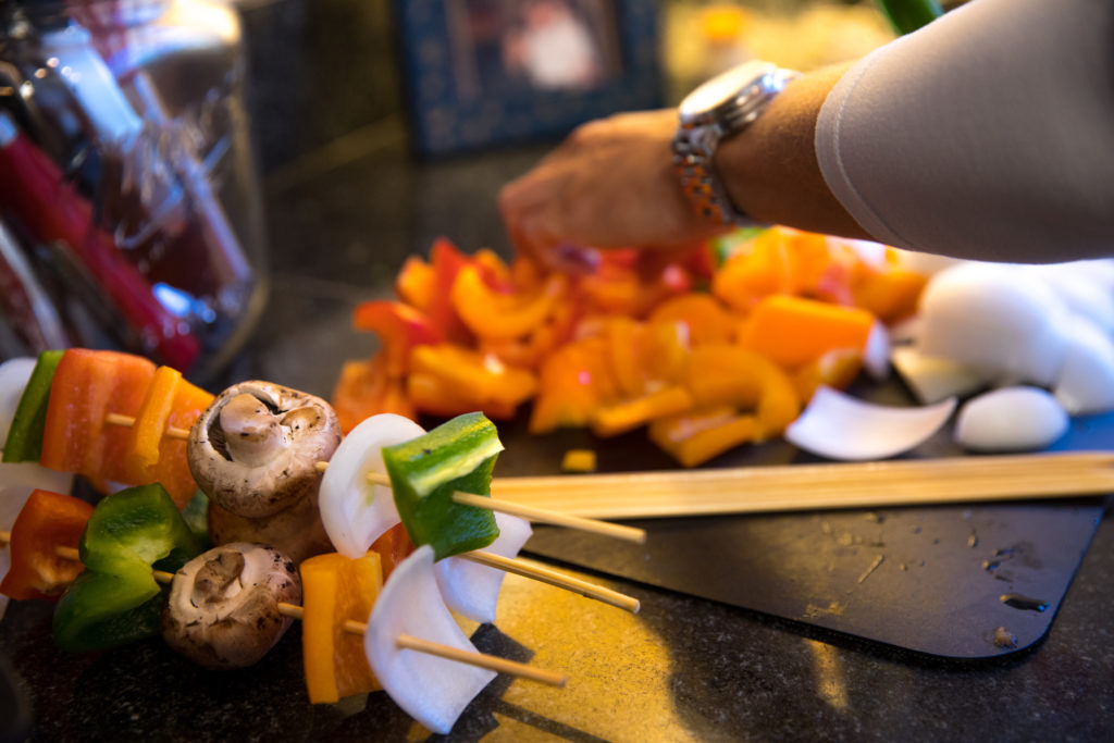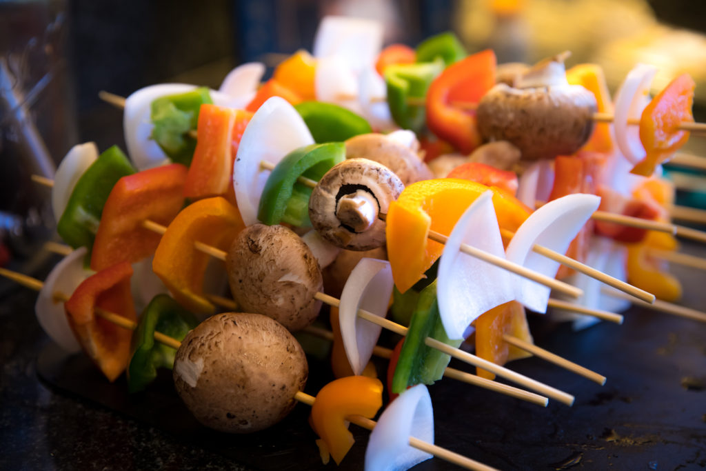 - Idagdag ang lahat ng mga gulay sa kabob sticks, at magsipilyo ng langis ng oliba. Budburan ang kabobs ng Italian seasoning, garlic powder, asin at paminta.