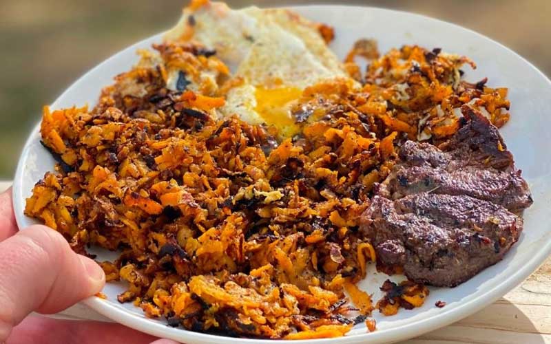 Kalapati na may Sweet Potato Hashbrowns at Itlog