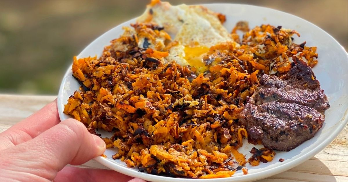 - Ihain ang kamote hash browns, itlog, bacon(opsyonal), at kalapati nang magkasama.