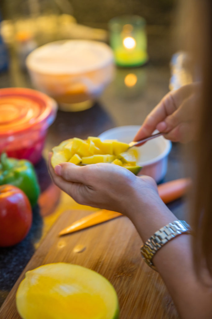 - Hiwain ang mangga, sibuyas, paminta, at cilantro sa maliliit na dices.