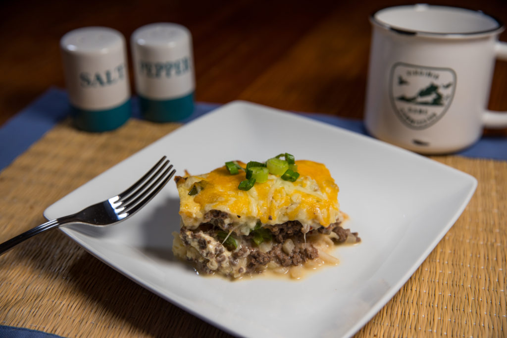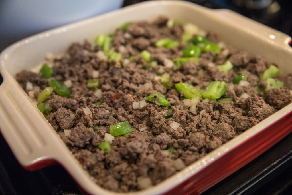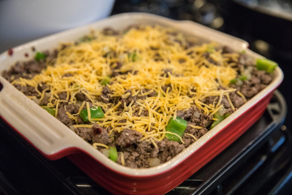 - Magpahid ng casserole dish, at idagdag ang hash browns sa ibaba. Layer na may isang tasa ng alinmang keso, pagkatapos ay i-layer sa karne, pagkatapos ay ibuhos ang pinaghalong itlog sa kaserol. Magdagdag ng natitirang tasa ng keso.
