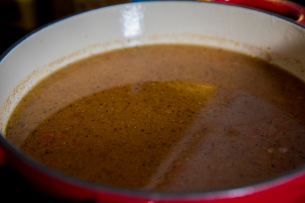 - Ibaba sa init sa med-low at magdagdag ng diced tomatoes, kidney beans, white beans, pepper, Worcestershire sauce at chicken broth. Dalhin sa kumulo.