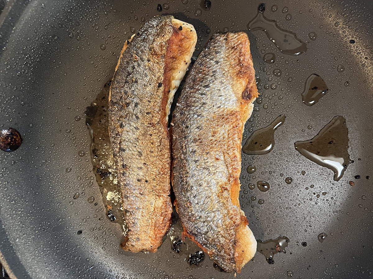 - Idagdag ang iyong isda, balat sa gilid pababa at maingat na panoorin ang isda upang hindi ito mag-overcook.