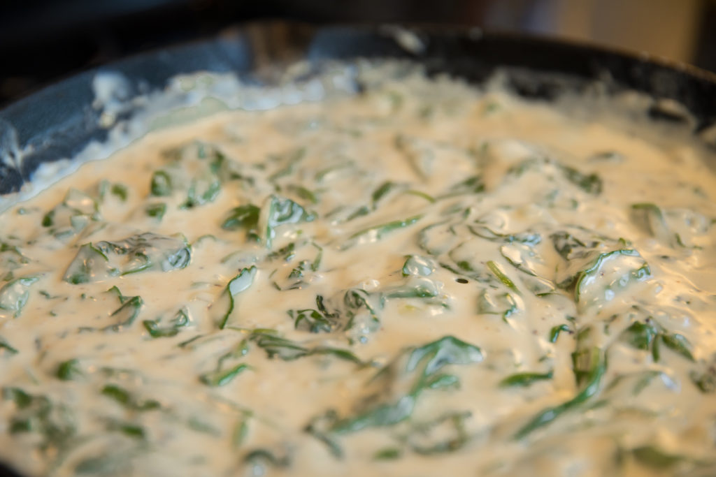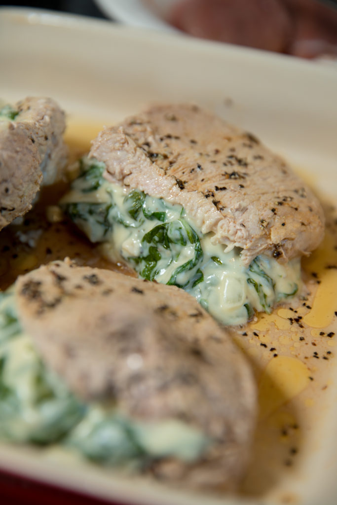 - Kapag tapos na, sandok ang creamed spinach sa nakabukas na mga suso ng pabo sa kawali, at isara ang mga suso upang ang creamed spinach ay sakop ng mga suso. Ang mga suso ay dapat na "pinalamanan" ng creamed spinach.