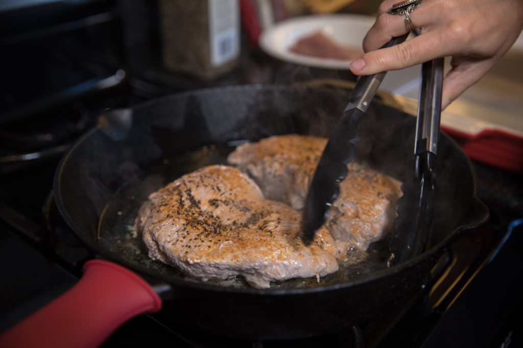 - Init ang langis ng oliba sa isang kawali at lutuin ang mga suso sa katamtamang init. Kapag naluto na, itabi sa oven-safe dish.