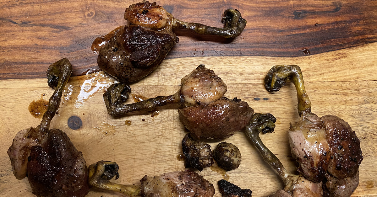 Mag-init ng cast iron sa medium-high heat. Magdagdag ng hindi bababa sa 1/2 kutsarang mantikilya bawat pato. Pinutol ko rin ang nabunot na buntot ng pato at idinagdag ito sa mantikilya para mawala ang ilang taba. Kadalasan ay nag-aaway kami kung sino ang makakain ng mga sunog na matabang buntot.