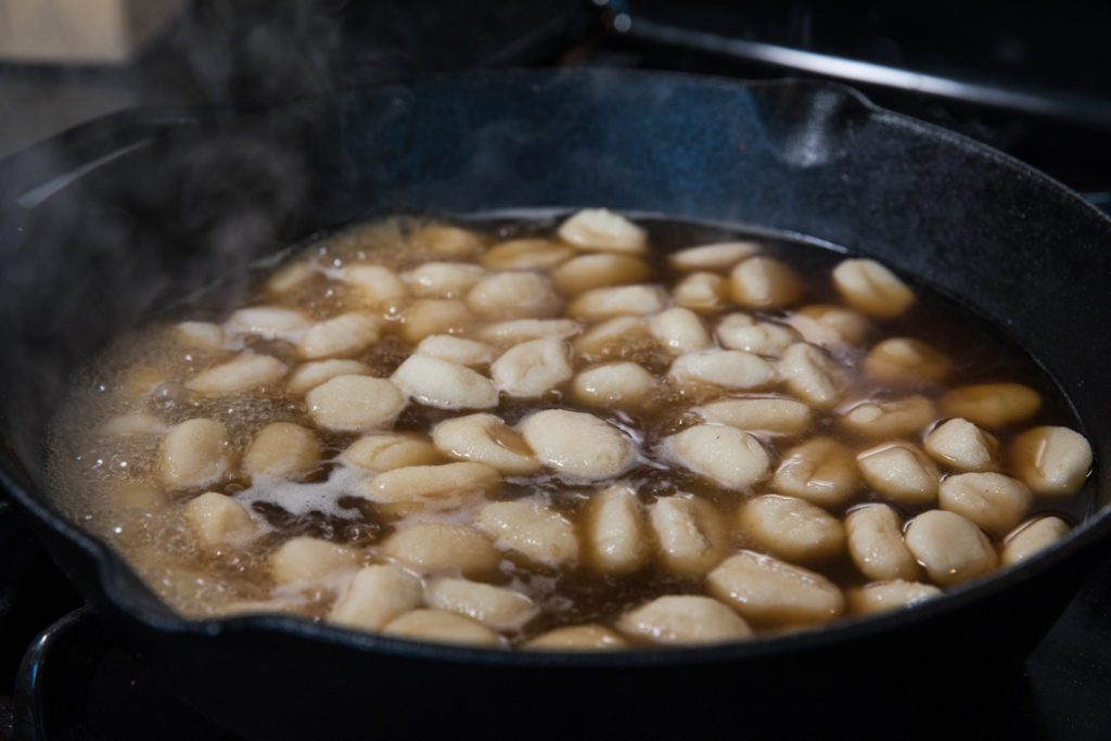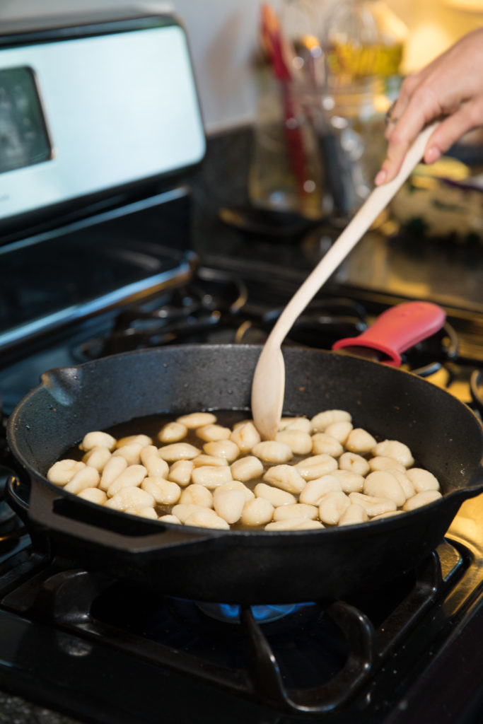 - Sa isang kawali, lutuin ang gnocchi ayon sa mga direksyon ng pakete, ngunit lutuin sa sabaw ng manok sa halip na tubig.