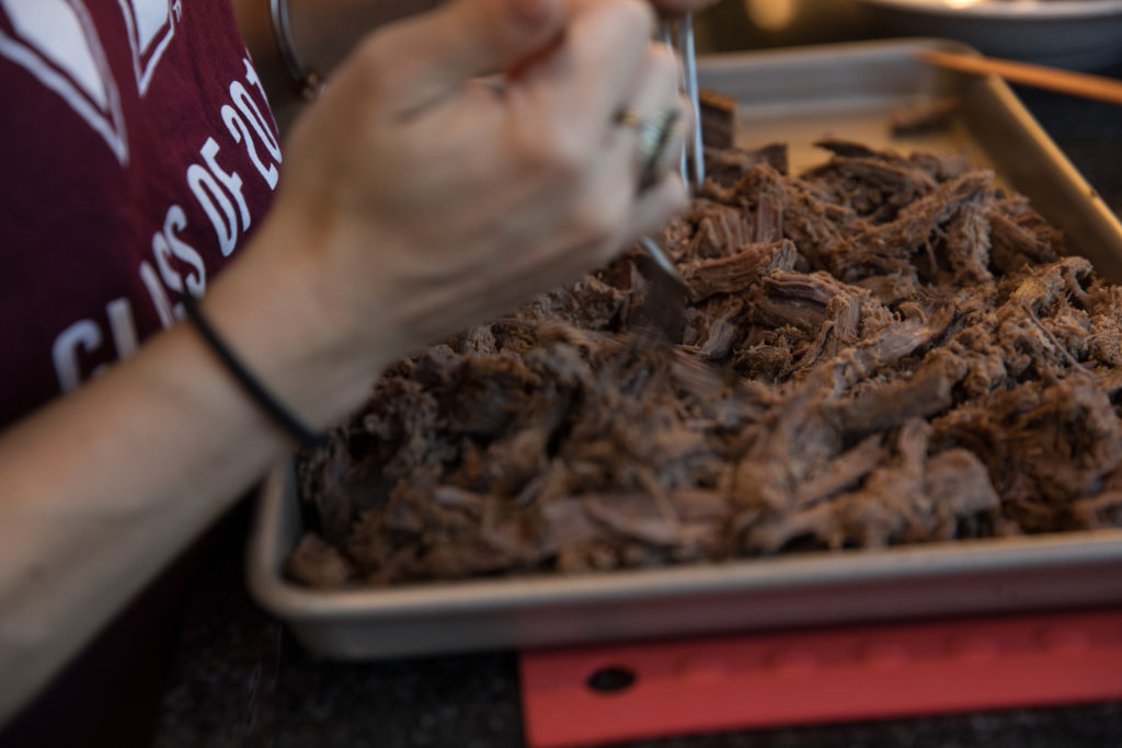 - Hiwalayin ang inihaw hanggang maputol ang lahat ng karne at ilagay ang sarsa ng BBQ. Haluing mabuti sa hinimay na karne. Hayaang kumulo ng ilang oras.