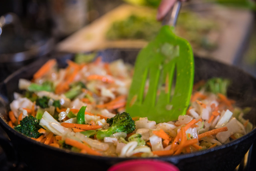 - Sa isang kawali na may langis ng oliba sa katamtamang init, magdagdag ng broccoli, repolyo, sibuyas, karot, at igisa hanggang malambot. Magdagdag ng sesame oil, teriyaki sauce, toyo at pampalasa sa mga gulay.