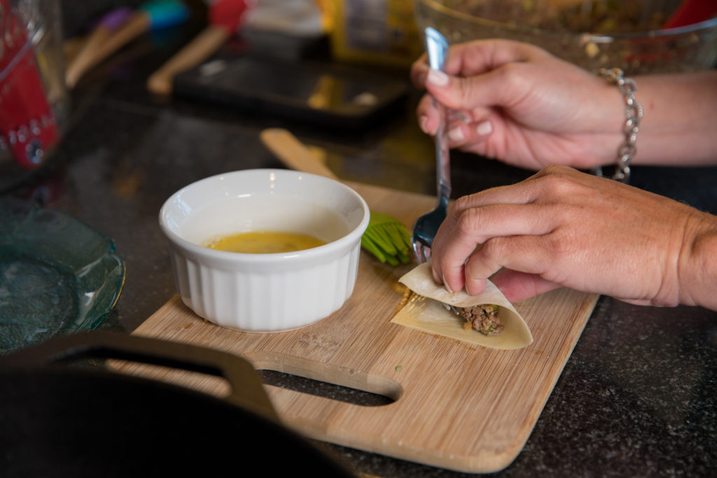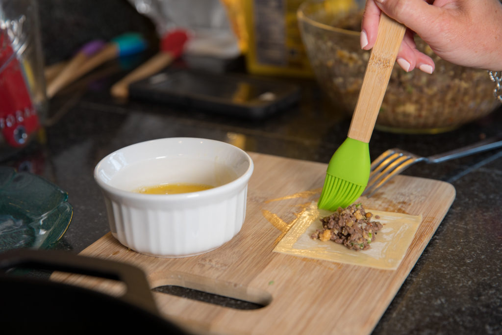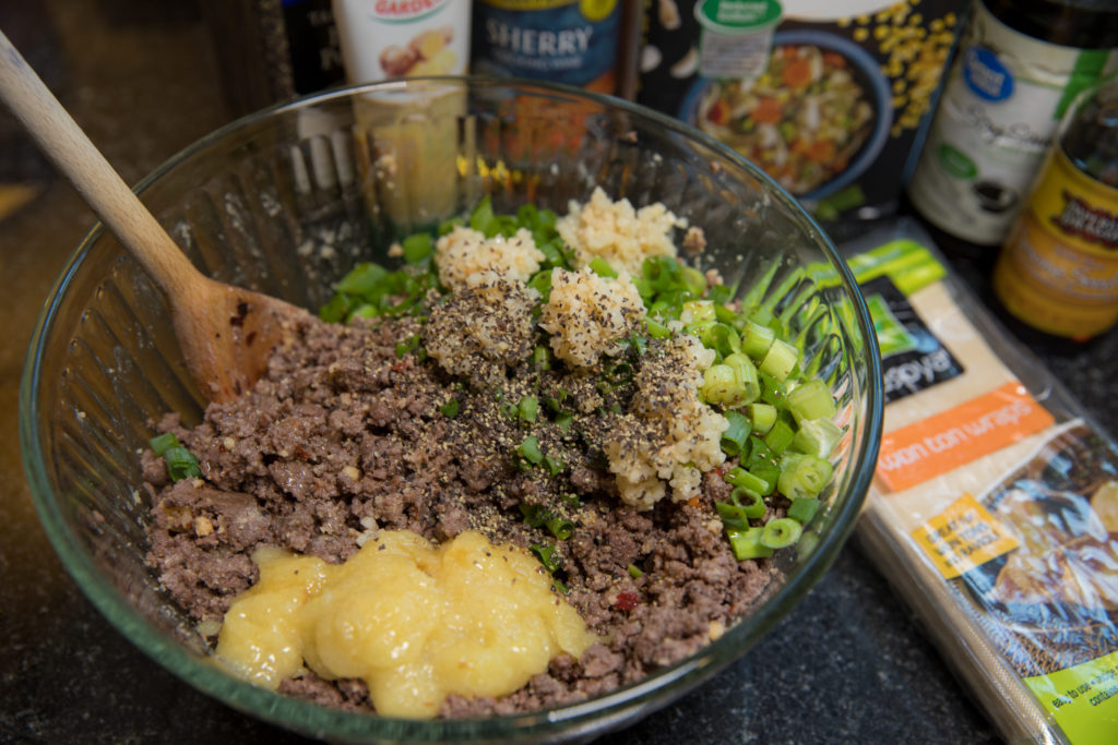 - Gawin ang pagpuno: a) Kayumanggi sa karne ng usa sa isang kawali sa katamtamang init at gumuho nang napakahusay. Hindi mo gusto ang mga tipak ng karne para sa recipe na ito! Itabi kapag tapos na. b) Sa isang malaking mangkok, pagsamahin ang lahat ng mga sangkap ng pagpuno hanggang sa maayos na maisama.