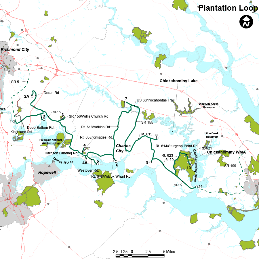 Ang Plantation Loop ay binubuo ng ilang mga site na 10 milya lamang sa timog-silangan ng Richmond at 15 milya sa kanluran ng Williamsburg. Ang maagang paninirahan sa kahabaan ng mayamang lupang pang-agrikultura, na may madaling pag-navigate sa kahabaan ng James River, ay humantong sa pagbuo ng maraming plantasyon. Marami sa mga plantasyon ng James River ang naibalik at bukas na ngayon para sa mga paglilibot sa bahay at bakuran. Ang pangunahing atraksyon para sa karamihan ng mga bisita ay ang kasaysayan at kadakilaan ng disenyo ng arkitektura ng mga tahanan ng plantasyon, ngunit ang mga masugid na naturalista ay makakahanap ng mga hardin at nakapalibot na mga natural na lugar na isang kasiya-siyang lugar para sa panonood ng wildlife. Ang kasaysayan ng maraming plantation loop-area venue ay ginagawang sulit ang paglalaan ng iyong oras sa kamangha-manghang rehiyong ito.