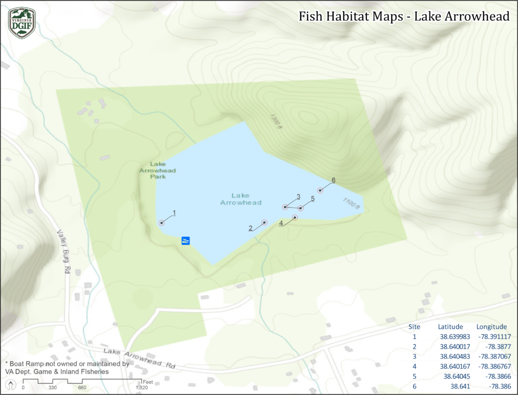 Kinakailangan ang isang wastong Virginia Freshwater Fishing License at isang Town of Luray Fishing Permit. Ang Mga Pahintulot sa Pangingisda ng Bayan ng Luray ay maaaring makuha nang personal mula sa Opisina ng Bayan ng Luray: Lunes-Biyernes (540-743-5511), Visitors Center Lunes-Linggo, at Fairview Grocery: Lunes-Sabado. Ang Town of Luray Boating Permit ay kinakailangan para sa lahat ng mga bangka sa Lake Arrowhead at maaaring mabili sa parehong mga lokasyon. Ipinagbabawal ang paggamit ng mga motor ng bangka. Malugod na tinatanggap ang mga de-koryenteng trolling motor.