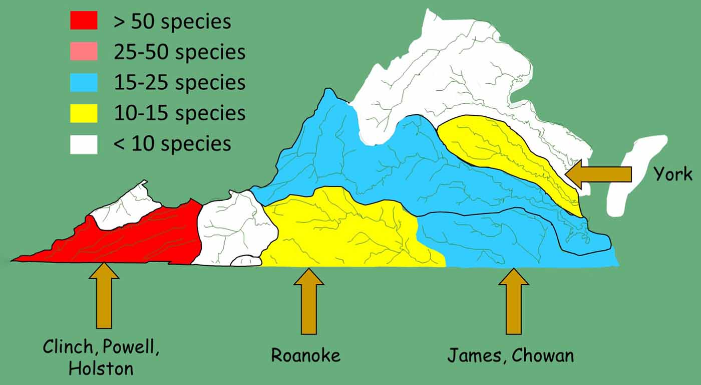 Ang pagkakaiba-iba ng mga freshwater mussel sa Estados Unidos ay walang kaparis. Sa tinantyang 1,000 species sa buong mundo, ang US sa kasaysayan ay naglalaman ng 304, humigit-kumulang 1/3rd ng kabuuang fauna ng mundo. Kung ihahambing sa ibang mga bansa at kontinente tulad ng Africa na may 96 species, China na may 60 species, at Europe na may maliit na 12 species, ang yaman ng US ay talagang kahanga-hanga. Ang malaking bahagi ng pagkakaiba-iba na ito ay matatagpuan sa timog-silangang mga drainage ng Ohio, Tennessee, Cumberland, at Mobile na mga ilog. Isa sa mga pinaka-magkakaibang drainage, ang Tennessee ay naglalaman ng 102 species, halos 1/3rd ng fauna ng bansa! Ang Virginia ay naging bahagi ng equation dahil ang Tennessee River headwaters ay nasa loob ng timog-kanlurang rehiyon ng estado. Ang bahagi ng Virginia ng Tennessee River drainage ay kinabibilangan ng Powell, Clinch, at Forks ng mga ilog ng Holston (North, Middle, at South). Sa loob ng mga ilog na ito, sa kasalukuyan ay mayroong mahigit 45 species ng tahong, ang ilan sa mga ito ay wala sa ibang lugar kundi ang upper Tennessee drainage.