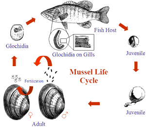 Ang ikot ng buhay ng freshwater mussel ay isa sa pinaka kumplikado at kawili-wili sa mundo ng hayop. Hindi tulad ng ibang mga hayop na maaaring aktibong maghanap ng mapapangasawa, ang sedentary mussel ay nakasalalay sa agos ng ilog upang magparami. Nagsisimula ang proseso sa paglalabas ng semilya ng lalaki, at ang babae na matatagpuan sa ibaba ng agos ay inilabas ito sa pamamagitan ng kanyang kasalukuyang siphon. Nagbibilang sa mga 100hanggang daan-daang libo, ang mga fertilized na itlog ay nagiging glochidia sa loob ng kanyang hasang. Kapag hinog na, sila ay inilalabas sa haligi ng tubig upang simulan ang ikalawang bahagi ng kanilang buhay-kabit sa mga hasang, palikpik, o kaliskis ng mga isda sa tubig-tabang. Sa puntong ito, ang proseso ay mas kumplikado dahil hindi lamang ang glochidia ay kailangang makahanap ng isang isda, ngunit ito ay dapat na isa sa ilang partikular na species ng isda para magpatuloy ang ikot ng buhay. Kung ang isang glochidium ay nakakabit sa tamang species ng isda, ito ay dumidikit sa tissue ng isda at sumasailalim sa maikling buhay bilang isang parasito.